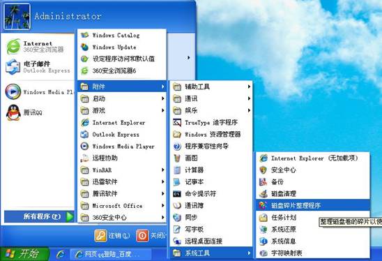 1.首先使用鼠标依次点击“开始”——“所有程序”——“附件”——“系统工具”然后单击“磁盘碎片整理程序”。如下图所示: