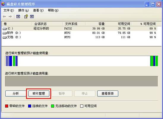 3.接着系统就会进行磁盘碎片的分析,当整理完成后会显示不同的颜色,我们可以在下方查看所代表的意义,下面我们只要点击“碎片整理”按钮即可;如下图所示: