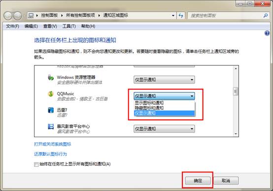 二、在弹出的控制面板中找到你需要显示的图标,将后面的“仅显示通知”改为“显示图标和通知”后点击“确定”即可。如下图所示: