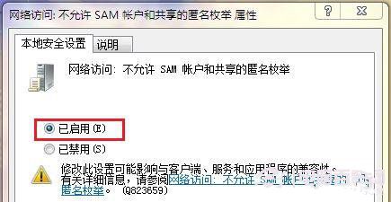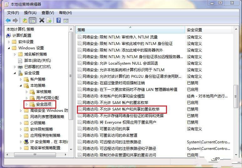 对于这种情况,我们首先可以关闭SAM账号和共享的匿名枚举功能。打开开始菜单中的“运行”窗口,输入“gpedit.msc”打开组策略编辑器,在左侧依次找到“计算机配置”—“Windows设置”—“安全设置”—“本地策略”—“安全选项”,双击右侧的“网络访问:不允许SAM账号和共享的匿名枚举”项,在弹出的窗口中选中“已启用”选项,最后单击“确定”按钮保存设置。经过这样的设置之后,非法用户就无法直接获得共享信息和账户列表了。