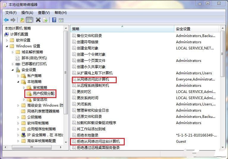 为了符合权限的最小性原则,我们可以对网络访问的账户作出严格限制。在打开的组策略编辑器中,依次选择“计算机配置”—“Windows设置”—“安全设置”—“本地策略”—“用户权限分配”,双击右侧的“从网络访问此计算机”,然后将一些必须使用网络访问的账户添加进来,并将例如Everyone、Guest之类的账户删除。然后再打开“拒绝从网络访问这台计算机”,同样的道理,只将需要访问共享目录的授权帐户添加进来,将其它用户全部删除。这两条策略同时作用时,前者取代后者。