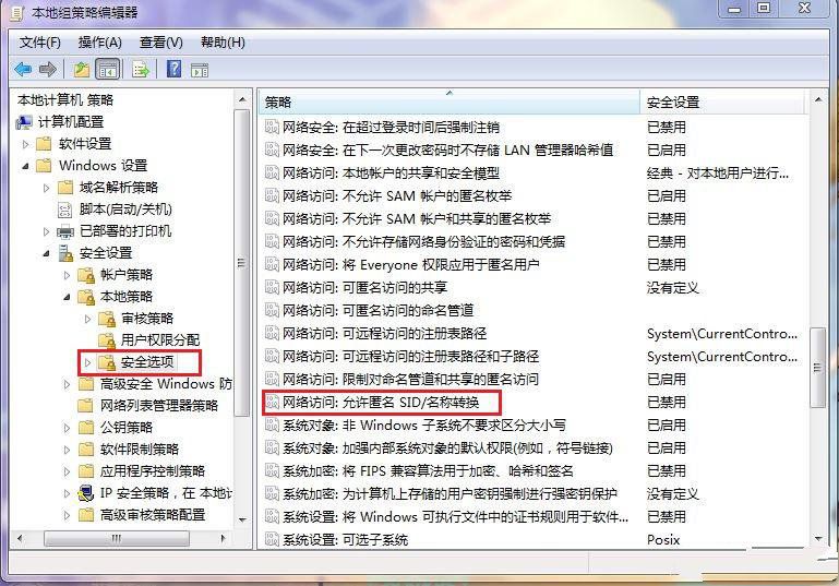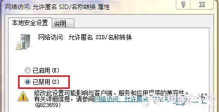 在前面我们已经禁止非法用户直接获得账户列表,但是非法用户仍然可以使用管理员账号的SID来获取默认的administrator的真实名称。对此,我们需要在组策略中打开“计算机配置”—“Windows设置”—“安全设置”—“本地策略”—“安全选项”,然后修改“网络访问:允许匿名SID/名称转换”为“已停用”。不过这样一来,可能会造成网络上低版本的用户在访问共享资源时出现 一些问题。因此网络有多个版本的系统时须谨慎使用该项配置。