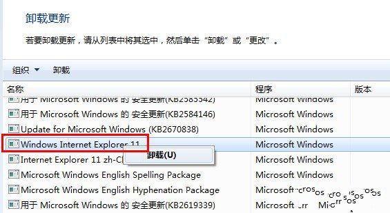 4、找到升级的IE浏览器版本,如我的“Windows Internet Explorer 11”,右击选择“卸载”