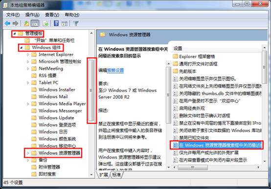 2.打开本地组策略编辑器后,在右边栏中中,依次进入“用户配置” — “管理模块” — “windows组件” — “windows资源管理器”(注意下拉滚动条),在左边栏中中,双击“在windows资源管理器搜索框中关闭最近搜索条目的显示”