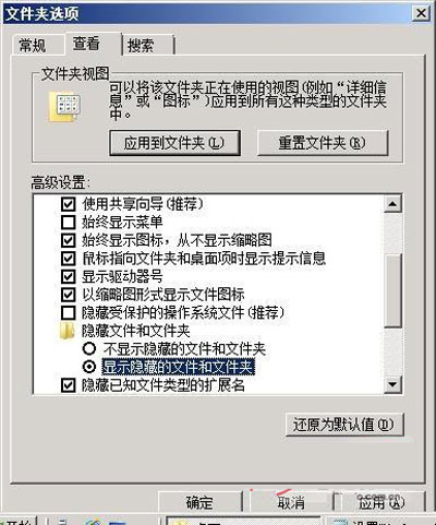 首先用鼠标双击Windows Server 2008系统桌面中的“计算机”图标,在其后窗口中单击“工具”/“文件夹选项”命令,在弹出的文件夹选项设置对话框中单击“查看”标签,并在对应标签设置页面中选中“显示隐藏的文件及文件夹”选项,同时取消选中“隐藏受保护的操作系统文件”选项的选中状态(如图所示),再单击对应界面中的“确定”按钮完成文件夹选项设置操作;