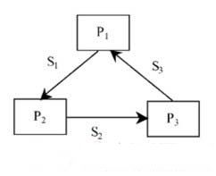 (3)临时性资源是指由进程产生、使用后无用的资源。如进程通信时使用的信件,如果对信件的发送和接收不加限制的话,则可能引起死锁。如图2所示,S1、S2和S3是临时性资源,分别由进程P1、P2和P3产生,进程之间的通信情况是:P1要求从P3接收信件,P3要求从P2接收信件,P2要求从P1接收信件。而实际的操作过程是:进程P1等待进程P3的信件S3来到后再向进程P2发送信件S1,P2又要等待P1的信件S1来到后再向P3发送信件S2,而P3也要等待P2的信件S2来到后才能发出信件S3。在这种情况下就形成了循环等待,发生死锁。