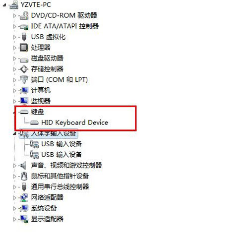 仔细观察人体学输入设备中有两个设备,通过硬件id确认其中USB 输入设备是鼠标,上面的英文设备实际上是键盘。也就是Windows系统错误的把键盘识别为了别的设备。