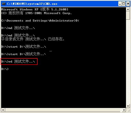 第六、若删除文件也得借助命令字符来进行删除,键入“rd 测试文件。。\”便能删除。