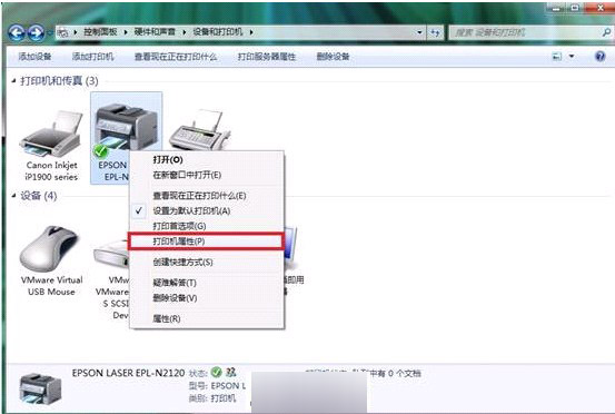 2.找到您安装的打印机的图标,右键,点击打印机属性。