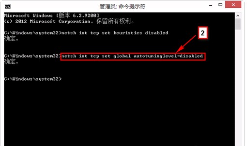 然后输入"netsh int tcp set global autotuninglevel=disabled";