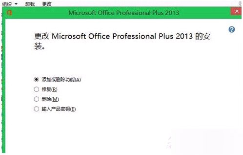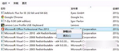 2.打开控制面板中的程序和功能项,进入卸载程序,找到Microsoft Office Professional Plus 2013然后右击更改。