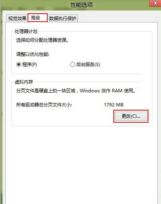 3. 弹出“性能选项”→“高级”→“更改”。