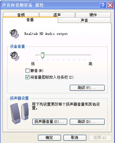 (1)在“控制面板”窗口中双击“声音及音频设备”图标,打开“声音及音频设备”属性对话框,它提供了检查配置系统声音环境的手段。这个对话框包含了音量、声音、音频、语声和硬件共5个选项卡如下图1所示。