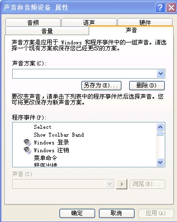 (4)在Windows XP中,系统预置了多种声音方案供用户选择。用户可以从“声音方案”下拉表中选择一个方案,以便给声音事件选择声音。