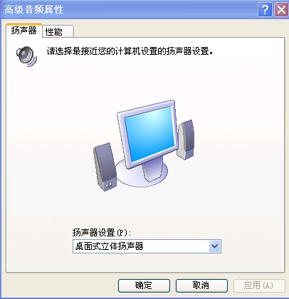 (8)单击“音量”选项卡中的“扬声器设置”区域中的“高级”按钮后,如下图4在弹出的“高级音频属性”对话框你可以为自己的多媒体系统设定最接近你的硬件配置的扬声器模式。