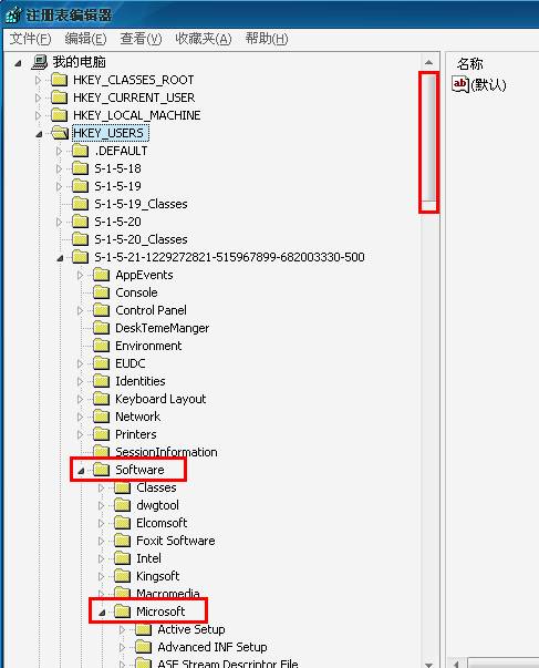 找到“software”双击展开,找到“Microsoft”项,双击展开。往下拉动右侧的滚动条如下图13。
