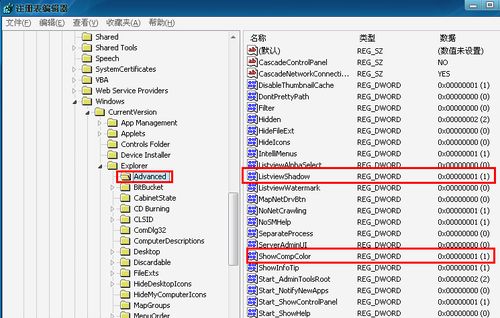 单击,选中“Explorer”像下面的“Advanced”项。如下图15在右侧栏中的找到“PstviewShadow”和“ShowCompColor”两个键。