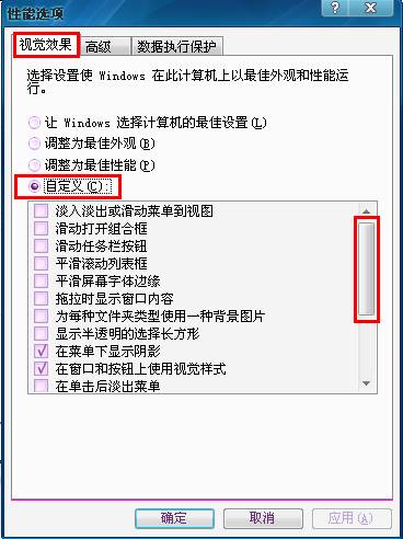 如下图5进入性能设置界面,“视觉效果”选项卡——选择“自定义”然后下拉右边的滑动条;