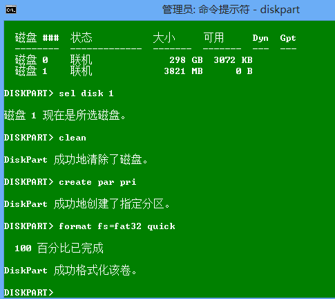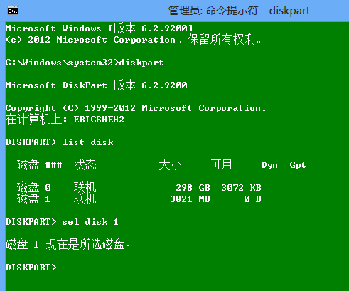 2. 执行 diskpart, 以及 list disk,找到你的U盘的编号(本例中是1),然后通过 select disk 1 选中该磁盘;