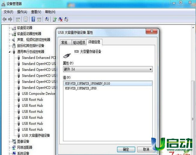 1、首先我们要做的就是把自己的u盘先插入计算机,让系统可以正常使用u盘,接着进入“控制面板”,双击“设备管理器”,“通用串行总线控制器”中“usb大容量存储设备”属性→详细信息→属性的硬件ID,复制出它的硬件ID保存一下。
