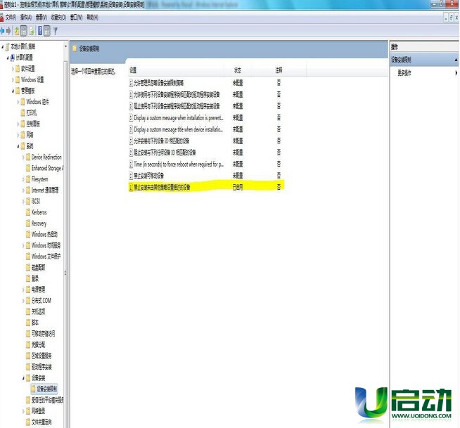 3、依次展开“计算机配置→管理模板→系统→设备安装→设备安装限制”,双击右侧的“禁止安装未由其他策略设置描述的设备”,在弹出的窗口中选择“已启用”,再点击 “确定”按钮,设置它可以来禁止策略没描述的uSB设备。