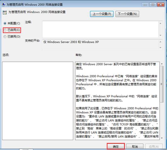 在“网络连接”选项的右侧,我们找到“为管理员启用Windows2000网络连接设置”,双击打开,如图所示: