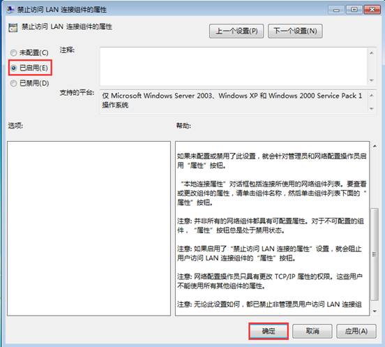 然后继续在“网络连接”右侧的窗口中打开“禁止访问LAN连接组件的属性”,如图所示: