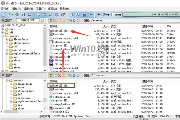 这里采用软碟通。用软碟通打开原版ISO镜像,在软件上部区域将sources\install.wim删除,在下部找到集成好语言包的install.wim拖到上面。最后另存为,大功告成。
