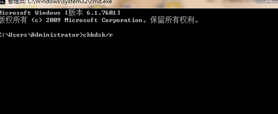 2、在打开的命令提示符窗口中,输入“chkdsk/r”命令后按回车运行,便可进入磁盘检测状态了。