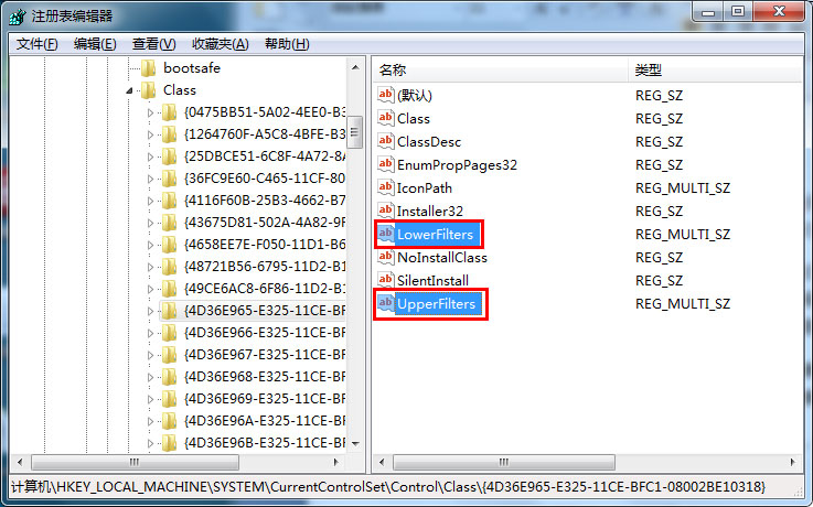 2、在注册表编辑器中,依次打开“HKEY_LOCAL_MACHINE--SYSTEM--CurrentControlSet--Control--Class--{4D36E965-E325-11CE-BFC1-08002BE10318}”然后看看其中是否存在“lowerfilters”和“upperfilters”然后将其删除。如下图所示: