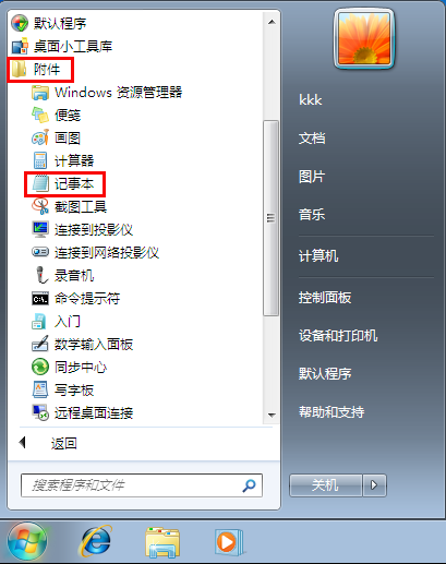 2.点击“附件”打开目录,单击“记事本”