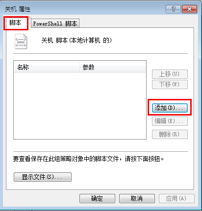 8.在跳出的“关机属性”中,选择“脚本”标签,点击右边的“添加”按钮