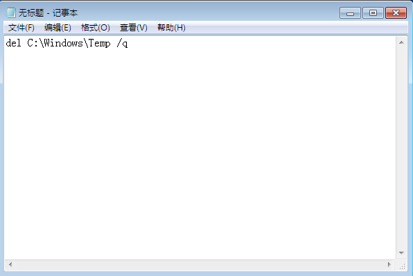 3.此时会新建一个记事本,输入“del C:\Windows\Temp /q”