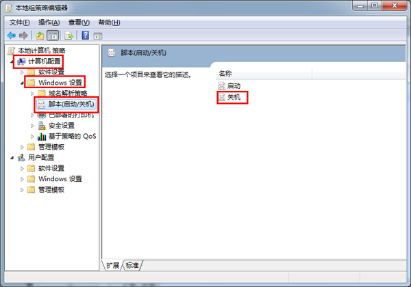 7.此时会打开“本地组策略编辑器”,在左边目录中,依次点击“计算机配置” — “windows设置” — “脚本(启动/关机)”,然后双击右边的“关机”标签