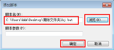 9.点击“浏览”按钮,在弹出的浏览中选择刚才在桌面上新建的“清除文件夹lhj.bat”文件,点击“确定”按钮。