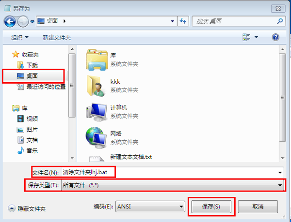 5.此时会弹出如下界面,在左边目录中选择要保存的路径(小编选择保存在桌面),在下方的“文件名”中输入“清除文件夹lhj.bat”,在保存类型中选择“所有文件”,然后点击右下角的“保存”按钮保存退出。