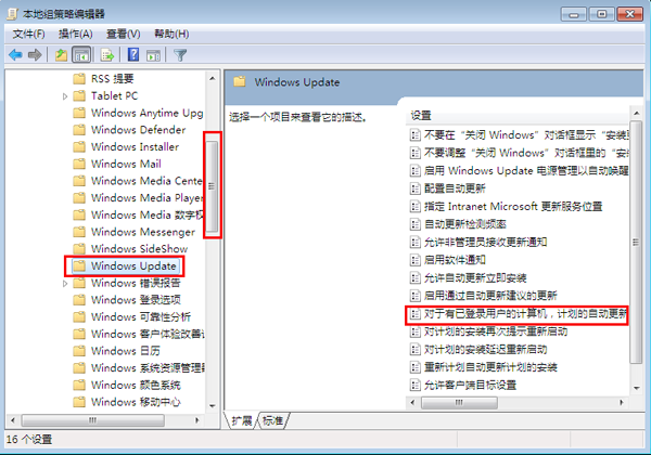 3.在左边的目录中,将滚动条下拉,如图所示,然后点击选择“windows update”,然后双击右边的“对于有已登录用户的计算机,计划的自动更新安装不执行重新启动”