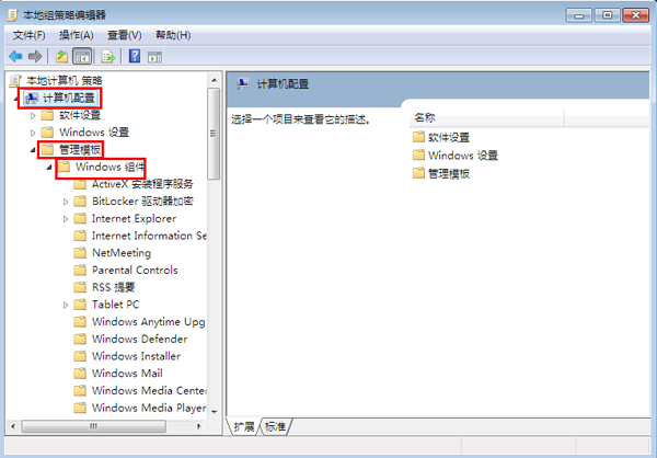 2.此时会打开本地组策略编辑器。在左边的目录中依次点击打开“计算机配置” — “管理模块” — “windows组件”