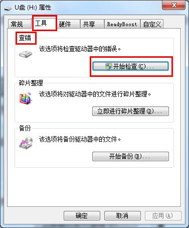 1.插入问题u盘,我们首先双击“计算机”→右键选择“u盘属性”→切换到“工具”选项卡→“查错”功能。如下图所示:
