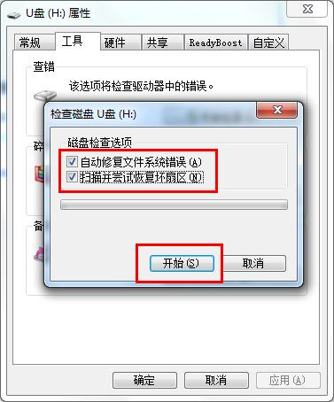 2.接着点击“开始检查”→勾选“自动修复文件系统错误”和“扫描并试图回复坏扇区”选项→然后点“开始”就可以了。如下图所示: