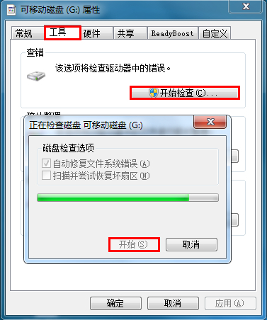 1.将鼠标移至问题u盘图标上,右键点击“属性”,在弹出窗口选择“工具”,再点击“开始检查”,最后点击“开始”等待检查磁盘;如下图所示: