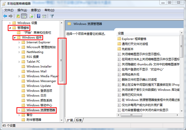 2.在左边栏目中,依次进入以下路径“用户配置” — “管理模块” — “windows组件” — 点击“windows资源管理器”(由于进入路径较长,注意下拉滚动条)