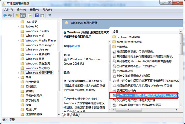 3.在右边栏目中双击“在windows资源管理器搜索框中关闭最近搜索条目的显示”