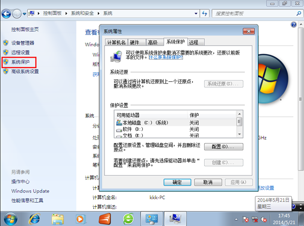 4.选中左方“系统保护”标签,进入系统属性菜单: