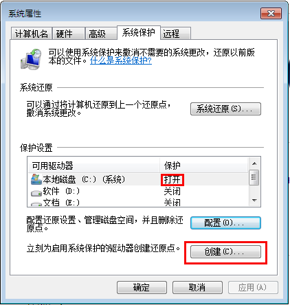 7.此时会回到“系统保护”页面,可以发现系统盘的保护状态已经变成“打开”,这就表示系统还原功能已经开启。此时我们就可以点击创建下图中“创建”按钮进行还原点的创建与设置。