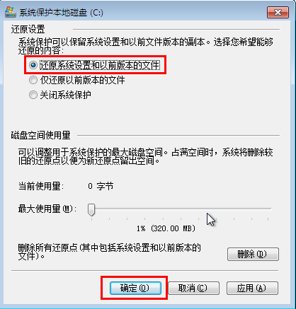 6.选中第一个选项“还原系统设置和以前版本的文件”,点击确定,如下图所示: