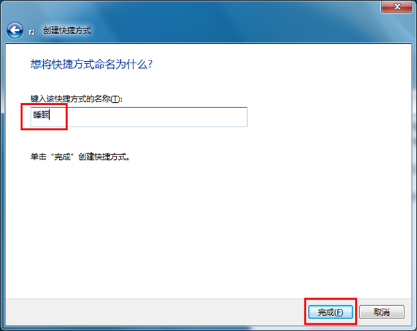 3.输入创建的快捷键名称“睡眠”,点击“完成”按钮