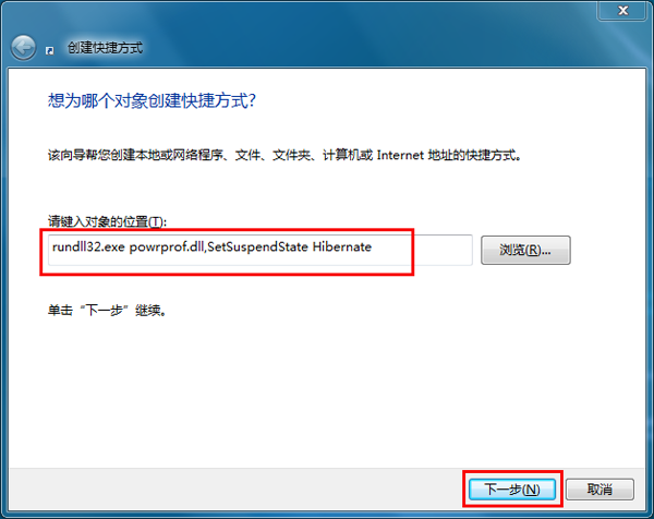 2.此时会弹出如下界面,在方框中输入“rundll32.exe powrprof.dll,SetSuspendState Hibernate”,然后点击“下一步”按钮