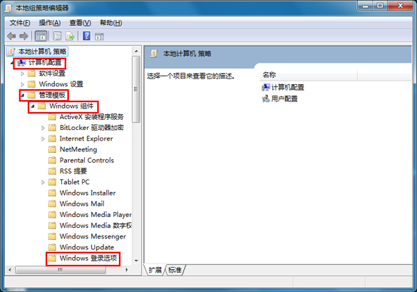 2.在打开的“本地组策略编辑器”中,从左边的栏目中,依次进入“计算机配置” — “管理模块” — “windows组件” — 点击“windows登录选项”