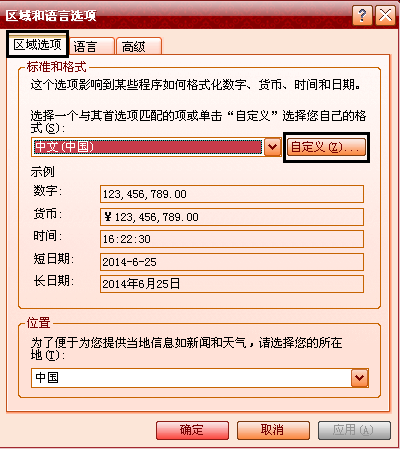 3.切换到“区域选项”选项卡,点击“自定义”按钮